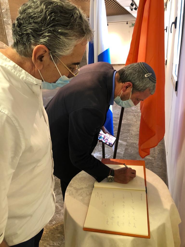 בתמונות: הרב רפי פרץ, חותם על ספר המבקרים ובתצלום עם ראש העיר חיים ברוידא וחברי מועצת העיר במהלך הביקור.